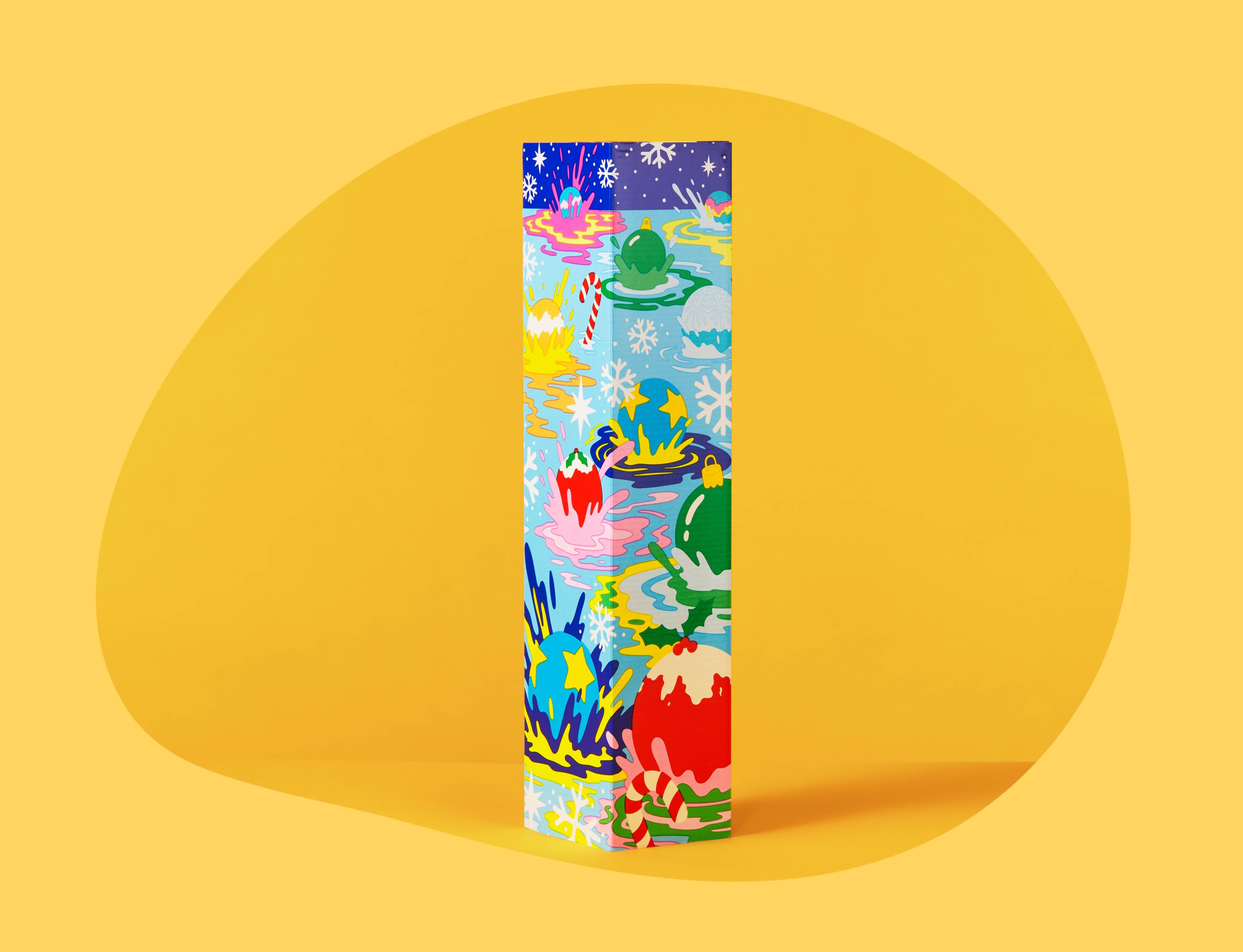 This reusable gift box fits up to five bath bombs and is designed by Tim Lahan, a graphic artist based in San Francisco who works to question the limits of reality and distill the complexities of everyday life in simple terms. His design takes a psychedelic approach to the bath bombs by having them fall from the sky like lost planets colliding and melting into the water below.
