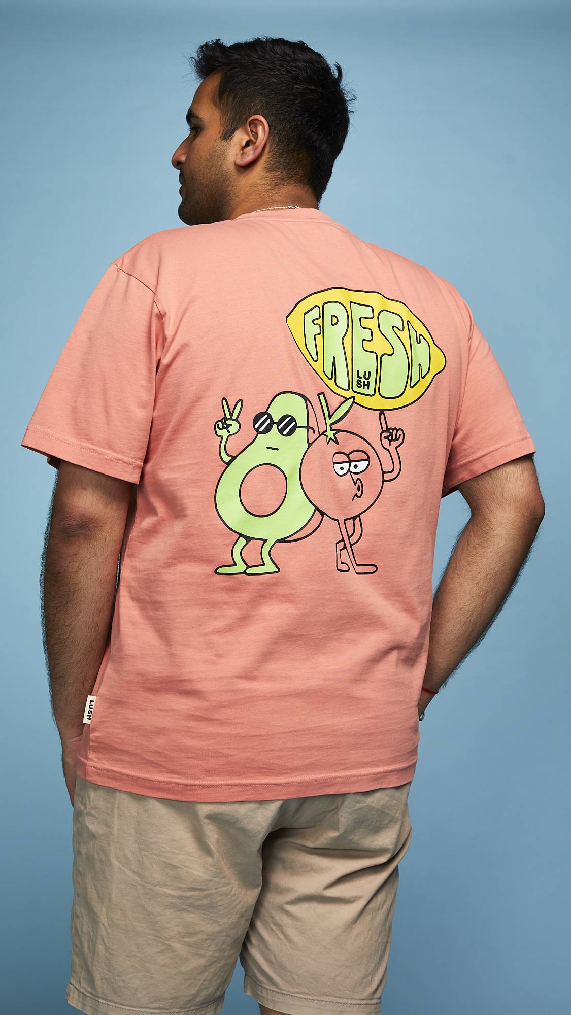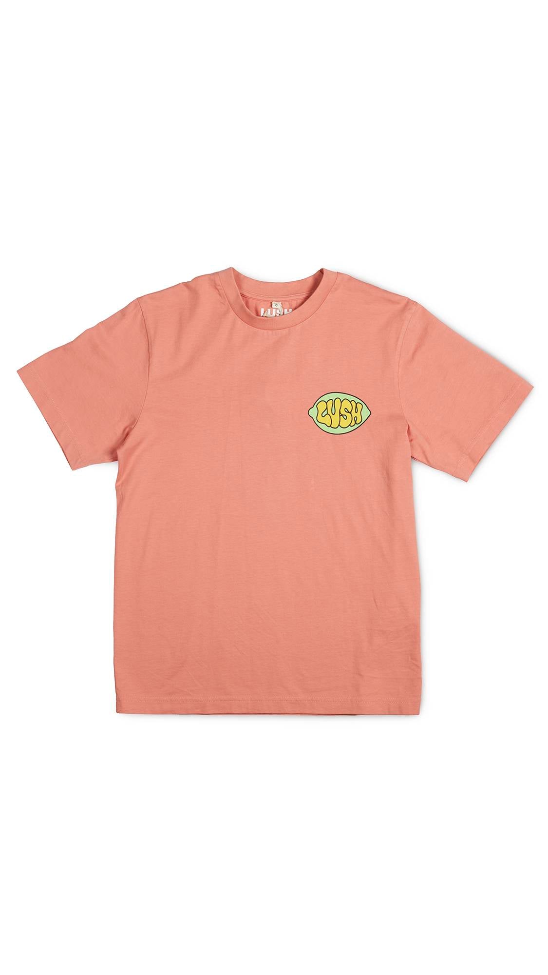 Fresh ingredients are intrinsic to Lush. Join us in a colorful celebration of this core Lush value at the heart of our philosophy while you stay cool in coral with this 100% organic cotton tee. The print was designed in collaboration with an artist local to the U.K., Dorset and features a small front pocket print and a larger print on the back.